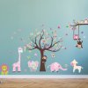 Velká barevná samolepka na zeď s motivem stromu plného barevných soviček, opiček a jiných zvířátek.