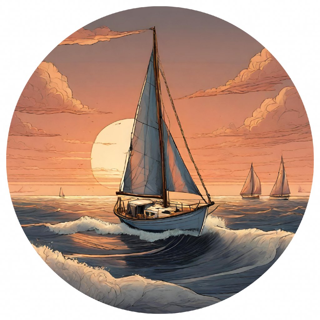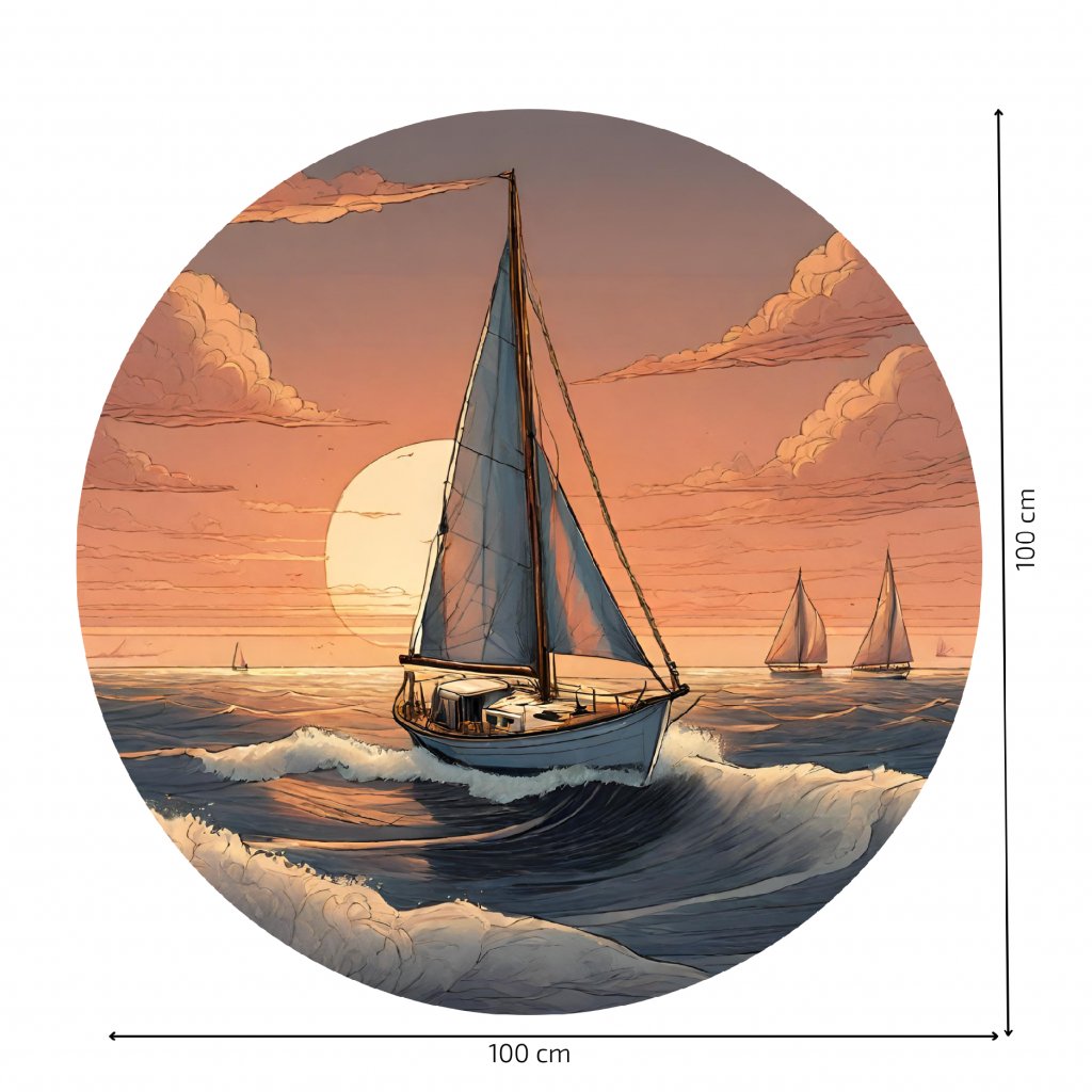 - Design: Scenický výhled na plachetnici plovoucí na vlnách s pozadím zapadajícího slunce.