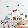 Samolepky různých letadel létajících nad veselými barevnými domečky.