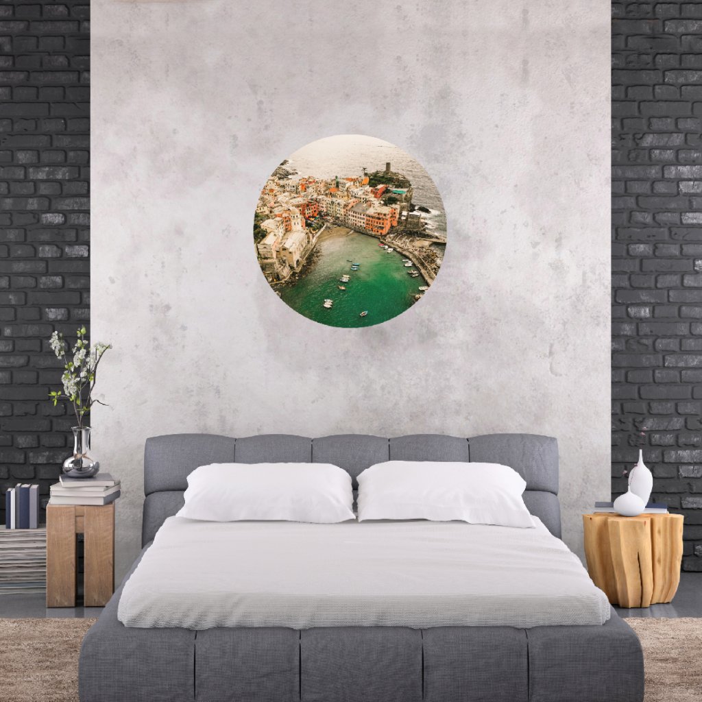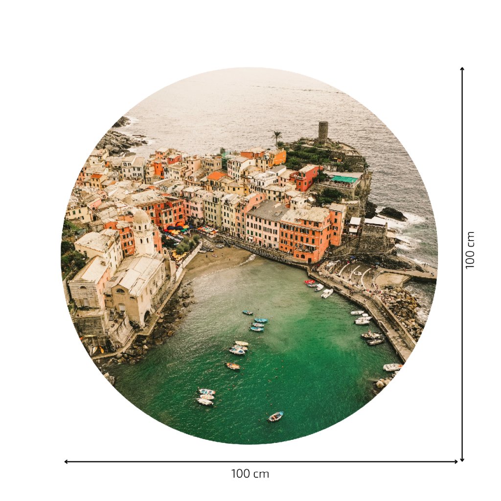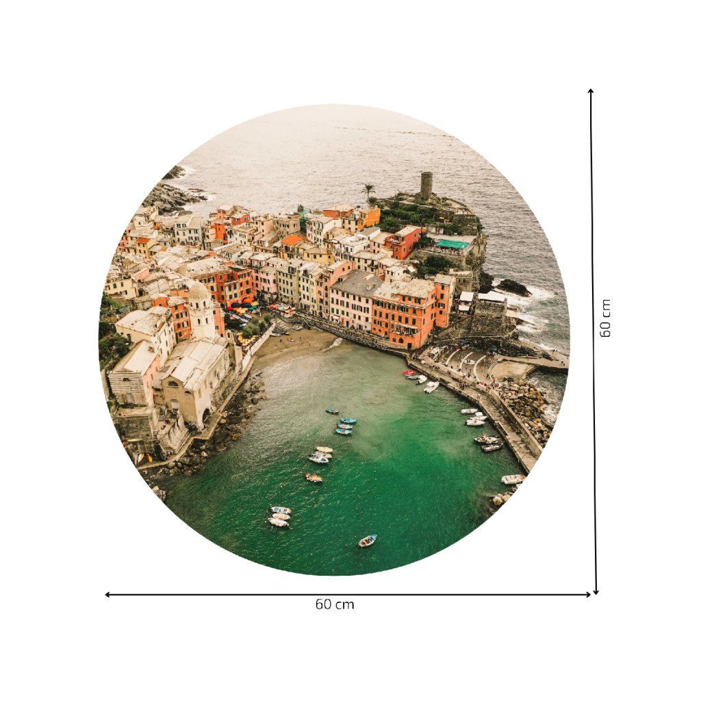 - Design: Nadčasová kruhová nálepka s výhledem na malebné italské městečko Vernazza v oblasti Cinque Terre vnese do tvého interiéru chuť na dobrodružství, vůni moře a barevnou atmosféru středomoří.