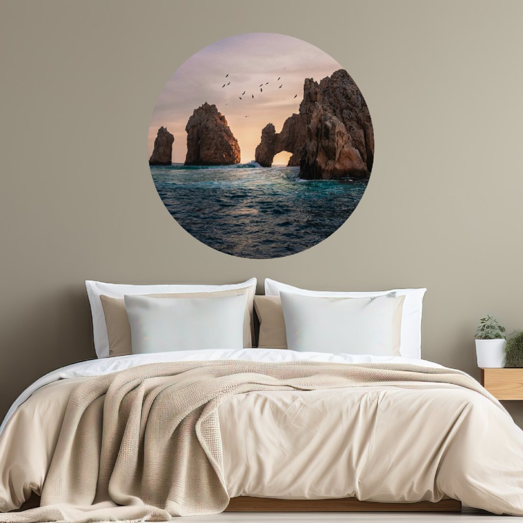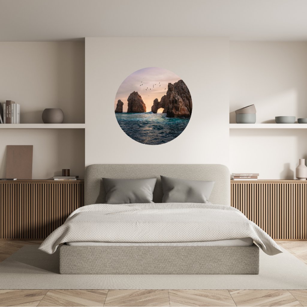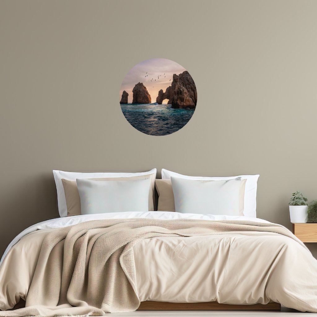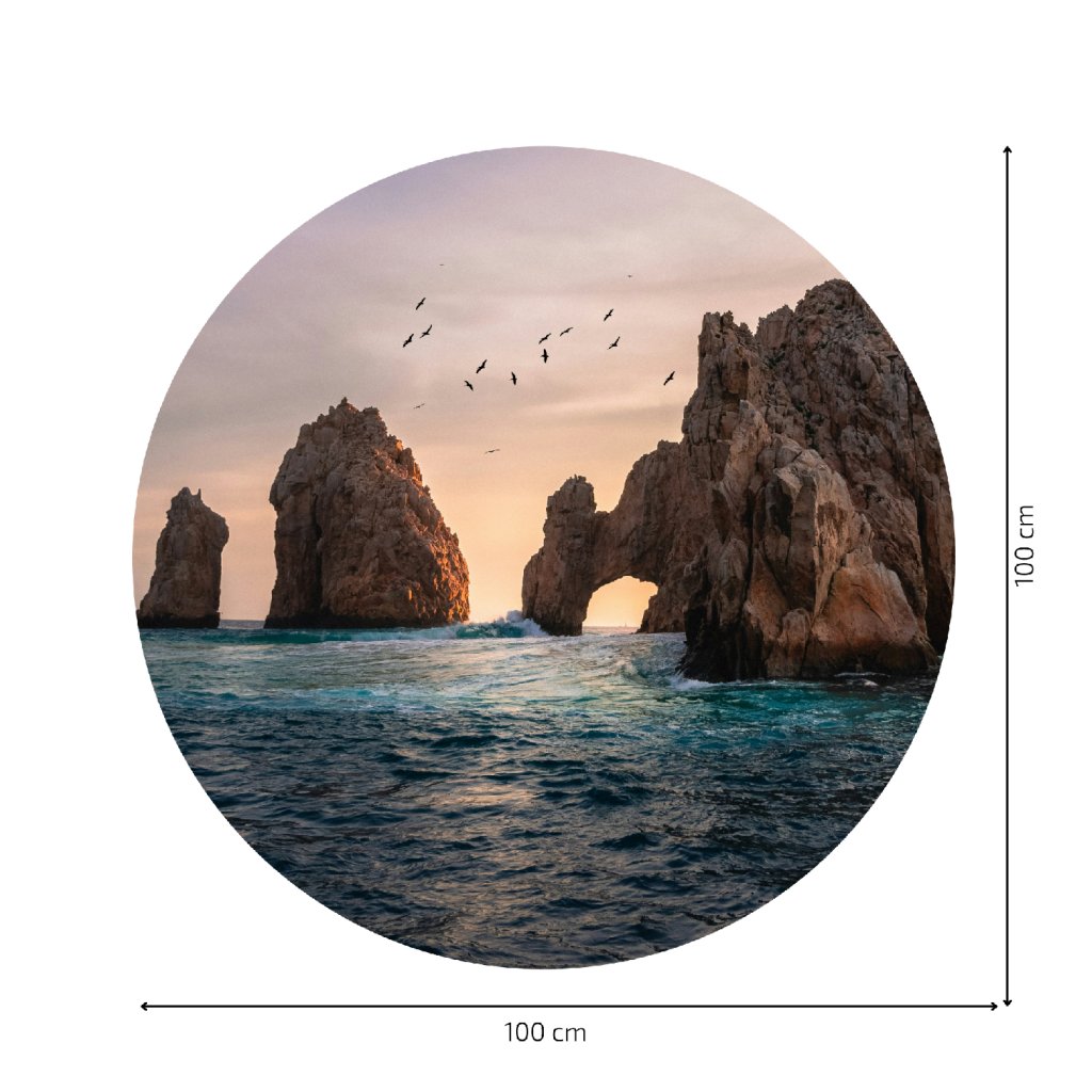 Textilní kruhová samolepka „Los Cabos“ zachycuje majestátní oblouk El Arco ve zlaté záři zapadajícího slunce. Vlny narážející na skály a ptáky kroužící nad oceánem vnášejí do prostoru pocit svobody, dobrodružství a nekonečného horizontu. Ideální pro ty, kteří milují moře, cestování a výjimečné momenty zachycené v jednom pohledu.