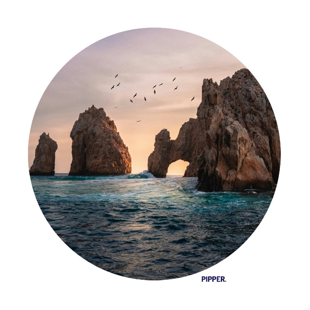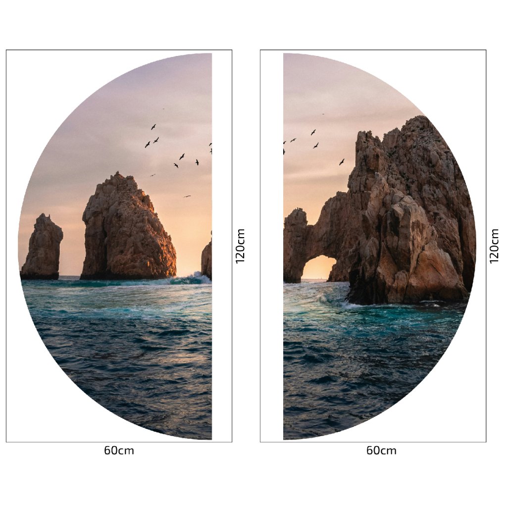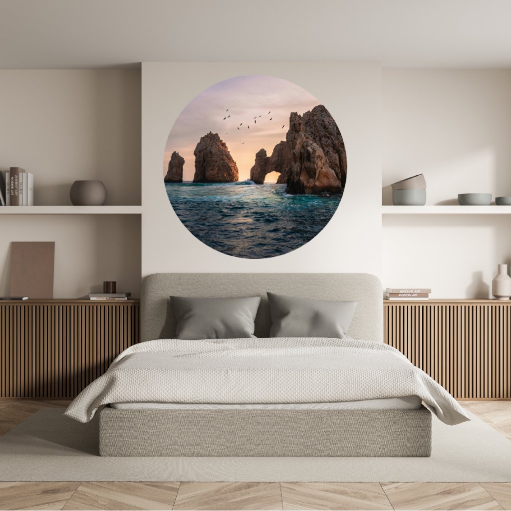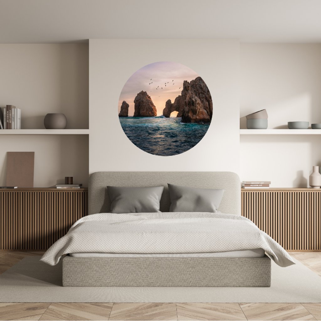 Textilní kruhová samolepka „Los Cabos“ zachycuje majestátní oblouk El Arco ve zlaté záři zapadajícího slunce. Vlny narážející na skály a ptáky kroužící nad oceánem vnášejí do prostoru pocit svobody, dobrodružství a nekonečného horizontu. Ideální pro ty, kteří milují moře, cestování a výjimečné momenty zachycené v jednom pohledu.