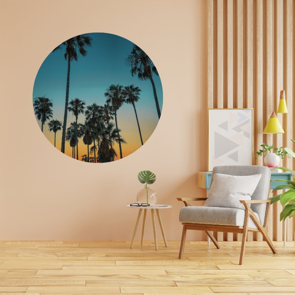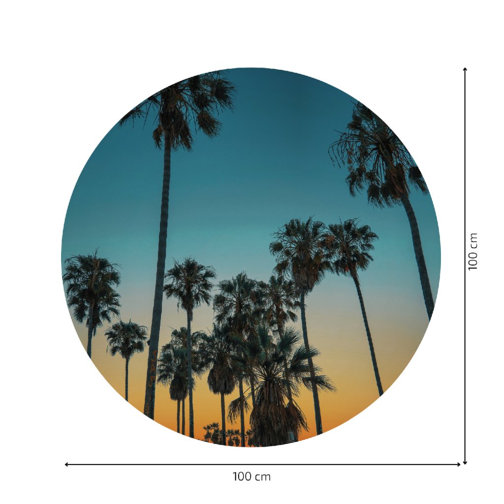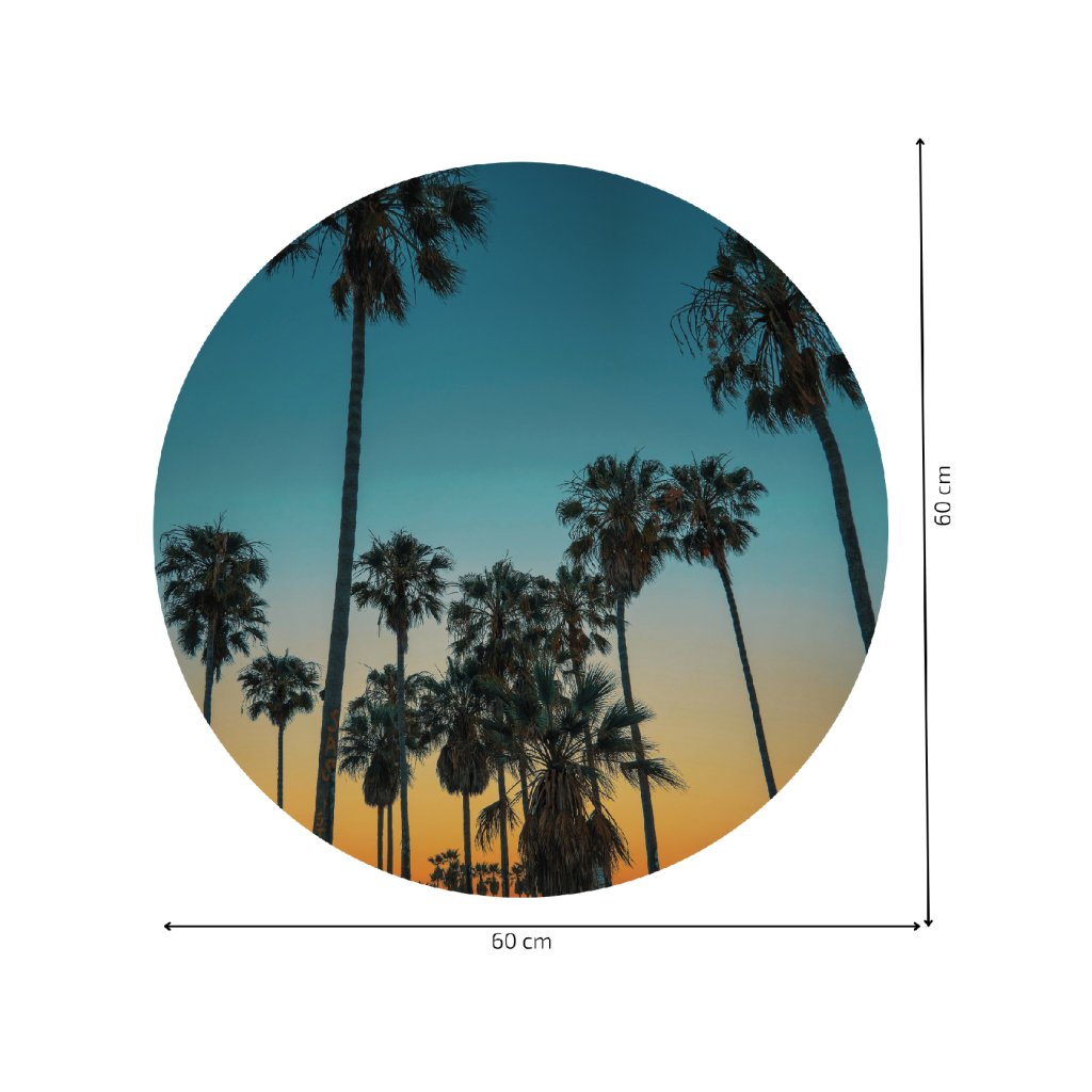 - Design: Nadčasová kruhová nálepka s motivem palem při západu slunce vnese do tvého interiéru závan léta, svobody a tropického klidu.