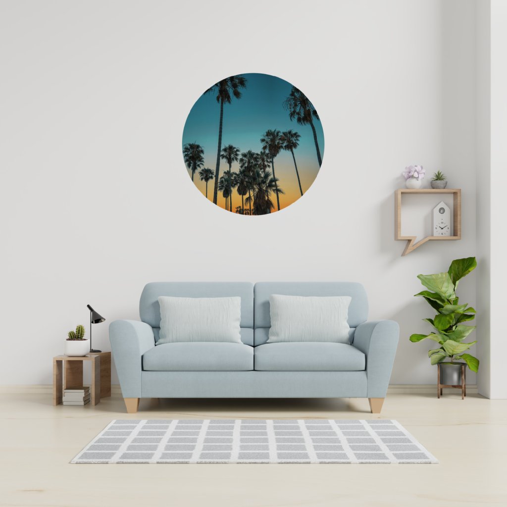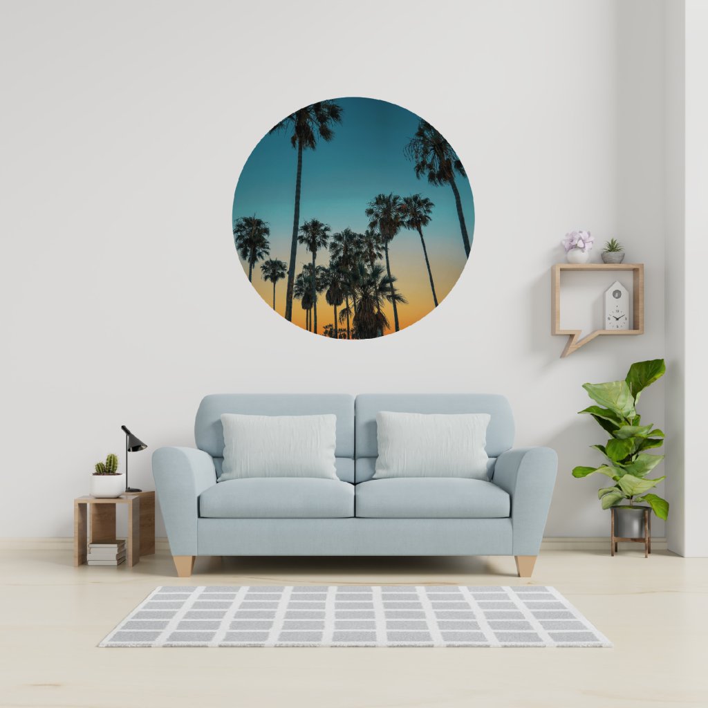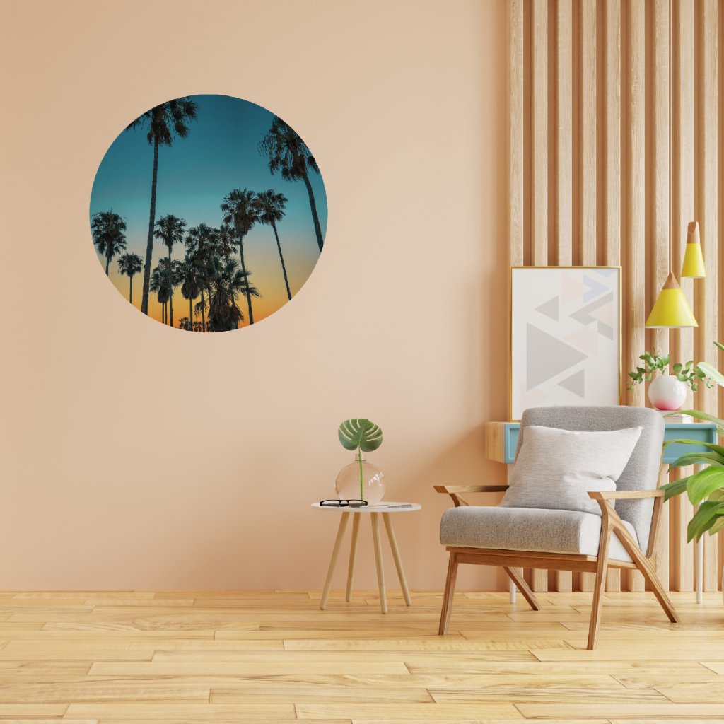 - Design: Nadčasová kruhová nálepka s motivem palem při západu slunce vnese do tvého interiéru závan léta, svobody a tropického klidu.