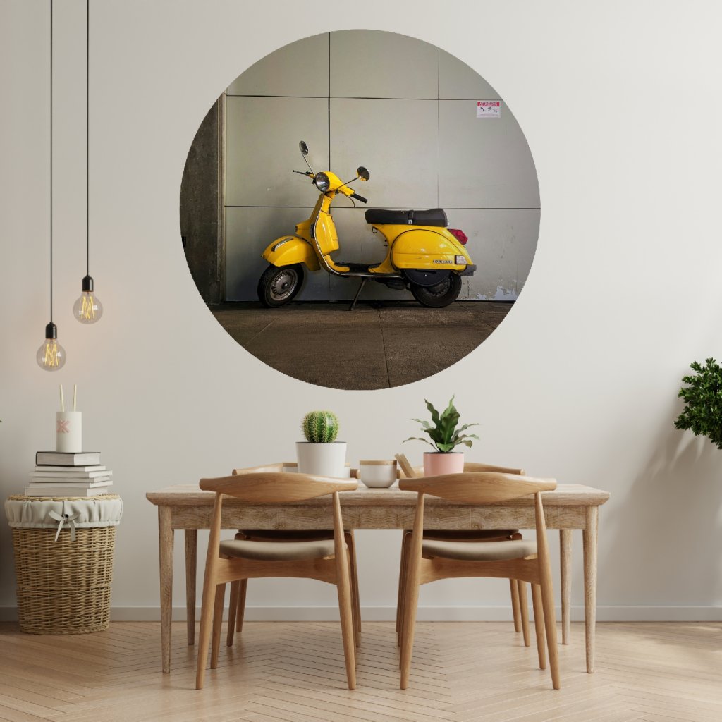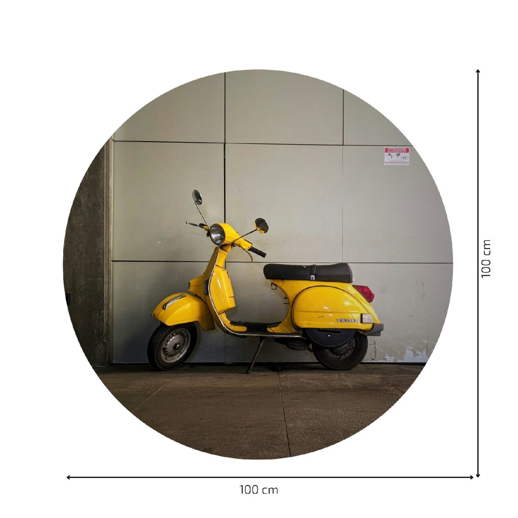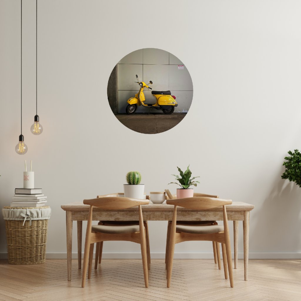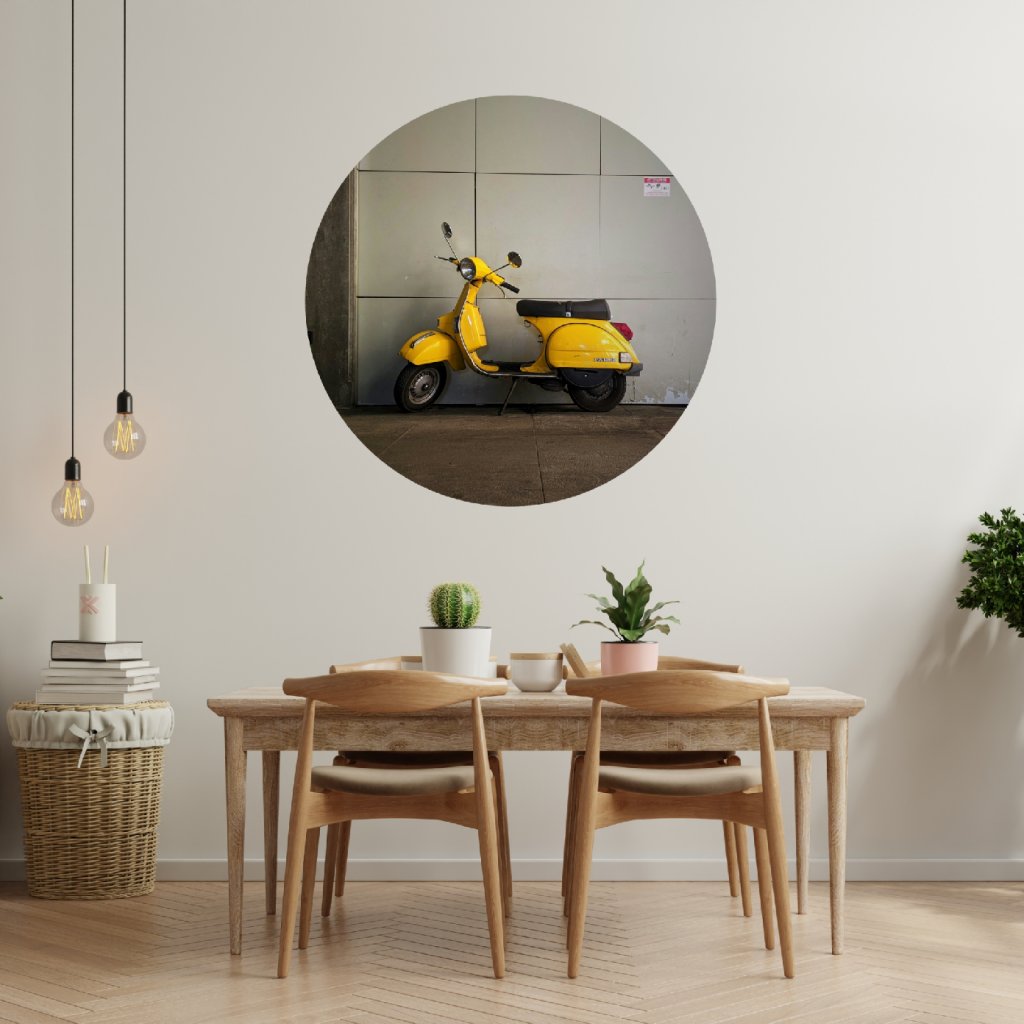 - Design: Nápaditá kruhová samolepka s ikonickou Vespou v zářivé žluté barvě dodá tvému interiéru špetku italského šarmu a městského retra.