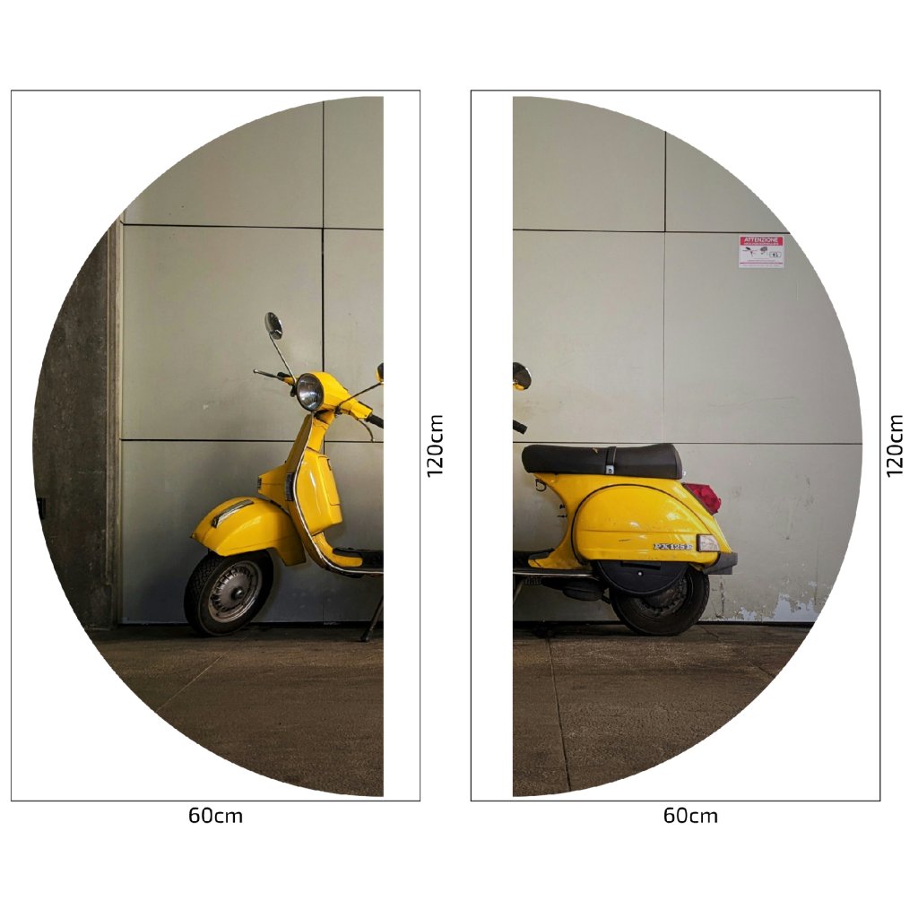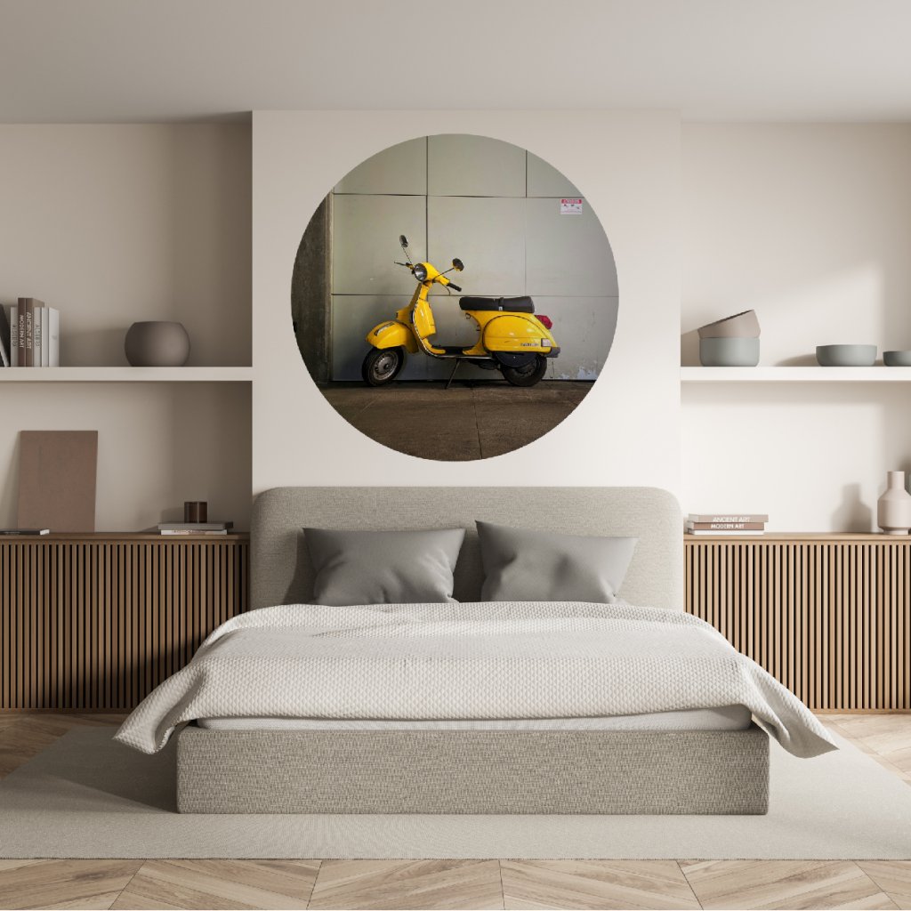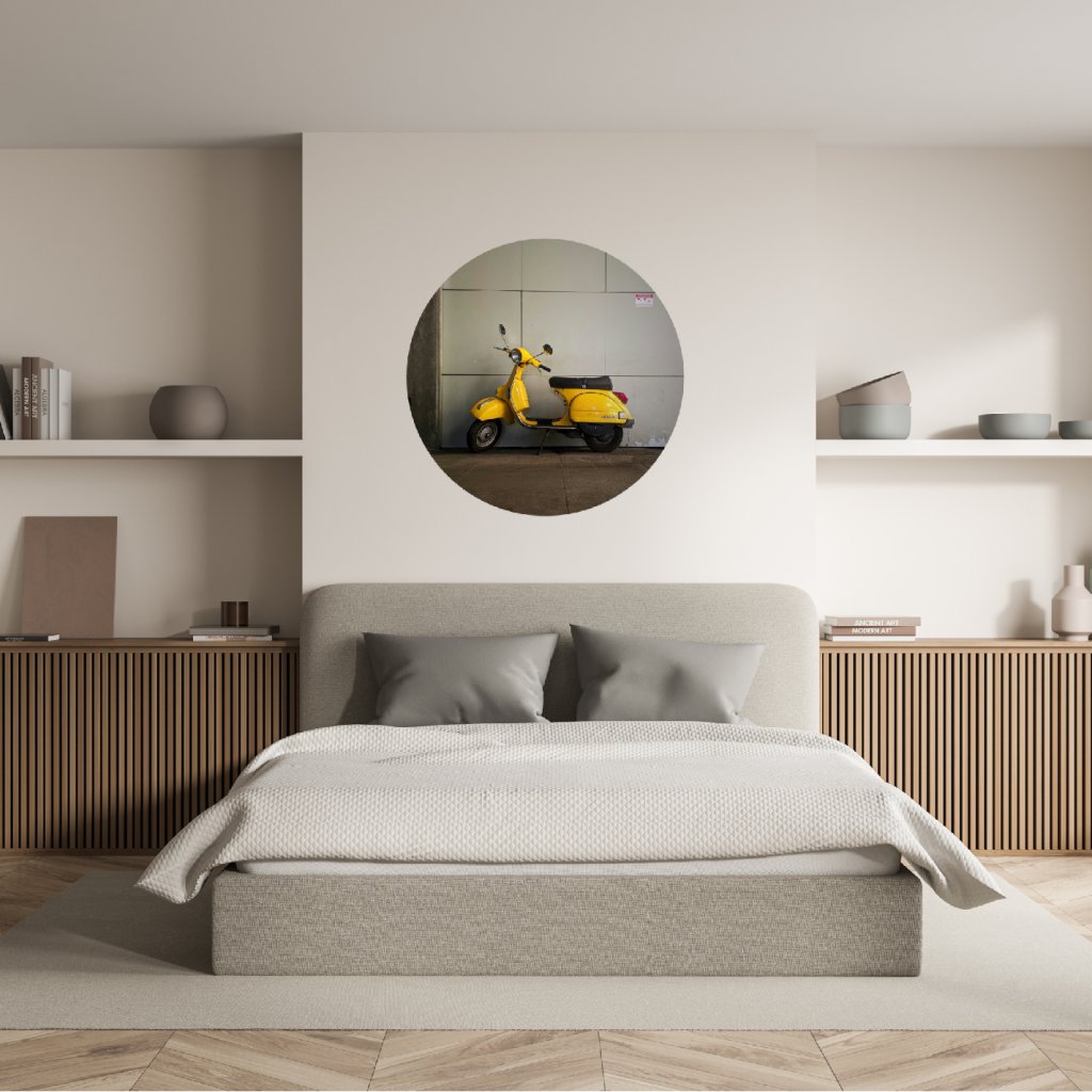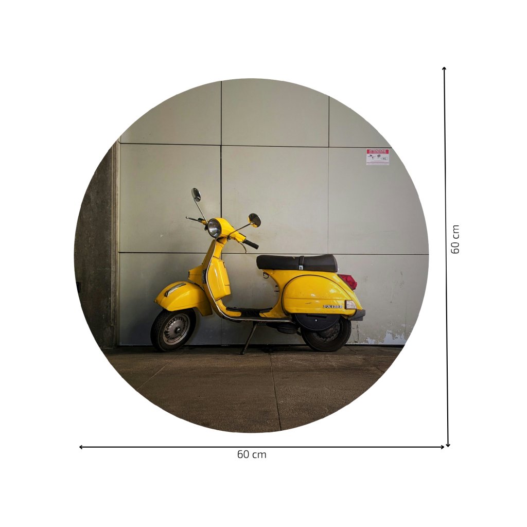 - Design: Nápaditá kruhová samolepka s ikonickou Vespou v zářivé žluté barvě dodá tvému interiéru špetku italského šarmu a městského retra.