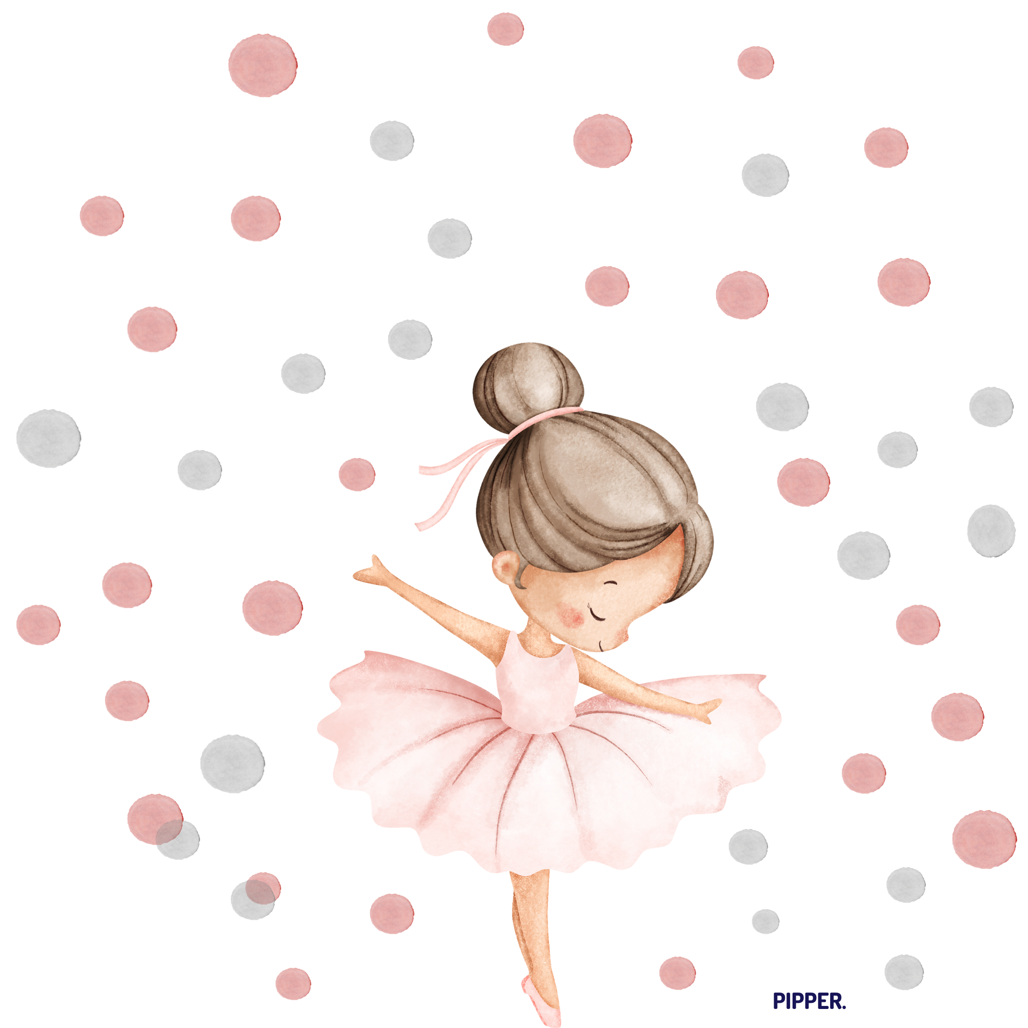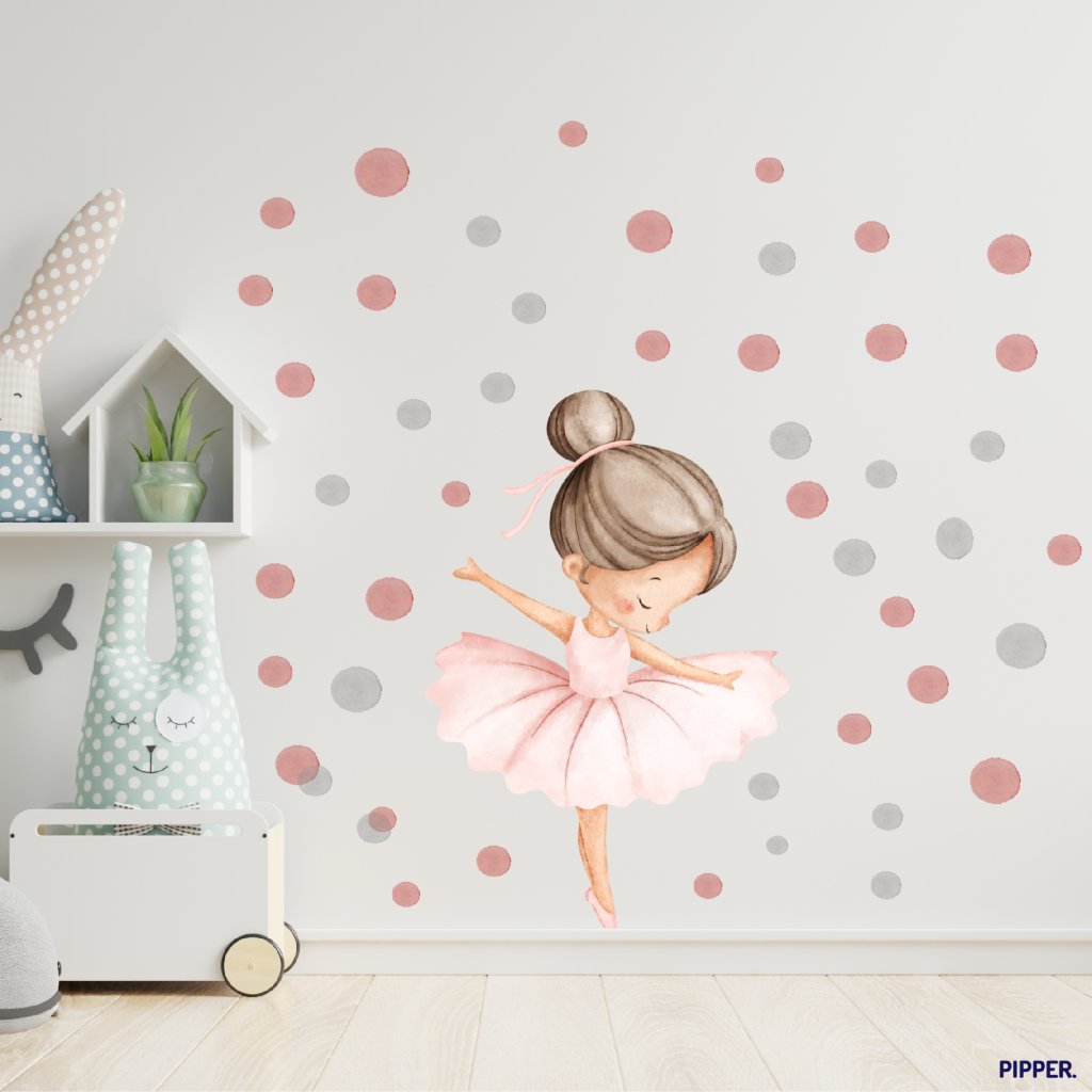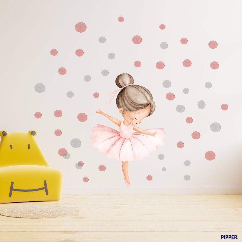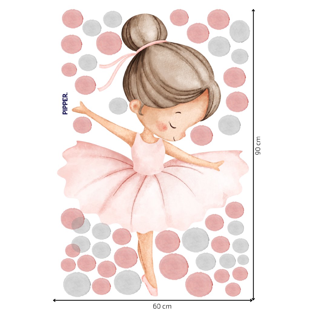 Design: Jemná akvarelová ilustrace baletky v růžových tónech doplněná bodovým vzorem. Nadčasový motiv, který působí klidně, lehce a elegantně – ideální do dívčího dětského pokoje.