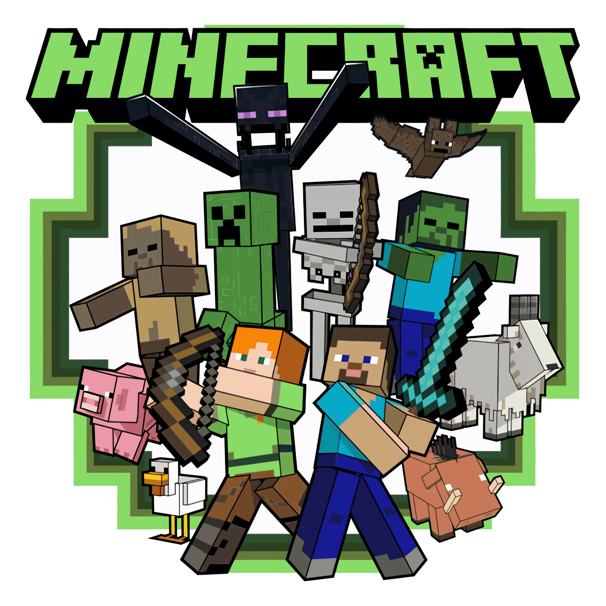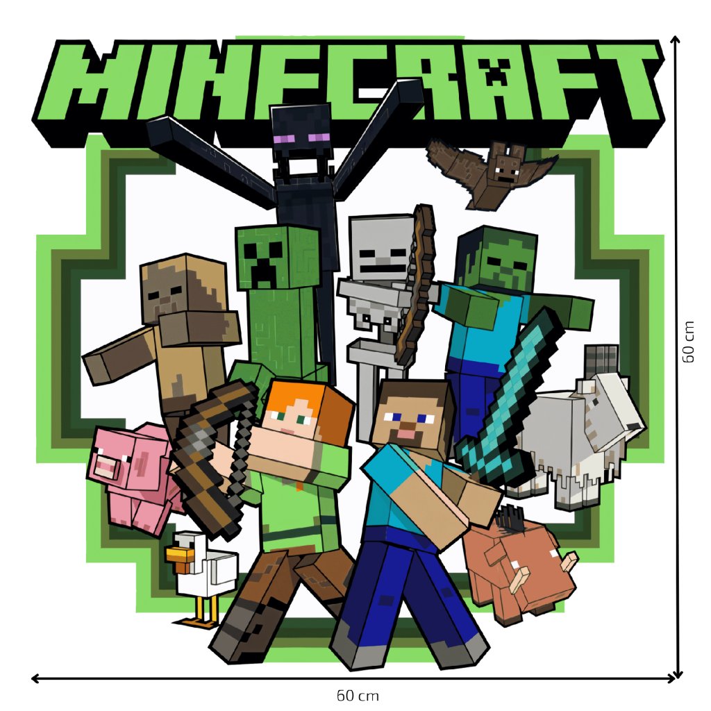 Design: Stylová samolepka s postavami ze hry Minecraft – Steve, Alex, creeper, zombie, skeleton, prase, slepice a další. 3D kostkovaný design ladí s moderními dětskými pokoji a přináší dynamiku a kreativitu.