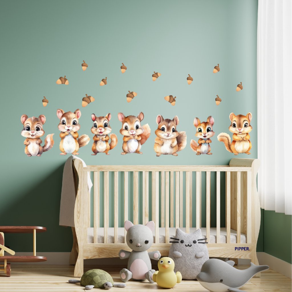 - Design: Rozkošné veverky, každá jiná, obklopené žaludy, které přinášejí hravý prvek do každé místnosti.