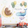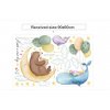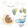 Samolepka se skládá ze 2 velkých samolepek, medvědi na Měsíci (60x60cm) a velká velryba s balony (39x60cm), 1 malé velryby a více doplňkových samolepek. Každá samolepka se lepí samostatně. Lepí se jako obyčejná samolepka. Je vodou omyvatelná.